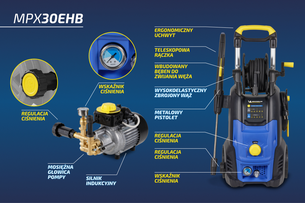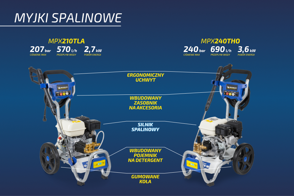 MICHELIN – legendarna marka znana z produkcji znakomitych opon samochodowych tym razem oferuje szeroką gamę myjek ciśnieniowych do czyszczenia wszelkiego typu pojazdów, warsztatów, hal, domów i otoczenia budynków. Świetnej jakości podzespoły (wyłącznie aluminiowe pompy), szereg innowacyjnych rozwiązań, niezawodność, konstrukcje ze składaną rączką i dostosowane do poziomego transportu w samochodzie, atrakcyjny design oraz przystępne ceny sprawiają, że ta nowa na polskim rynku oferta szybko zdobywa nowych użytkowników i mamy nadzieję, powtórzy sukces opon Michelin.